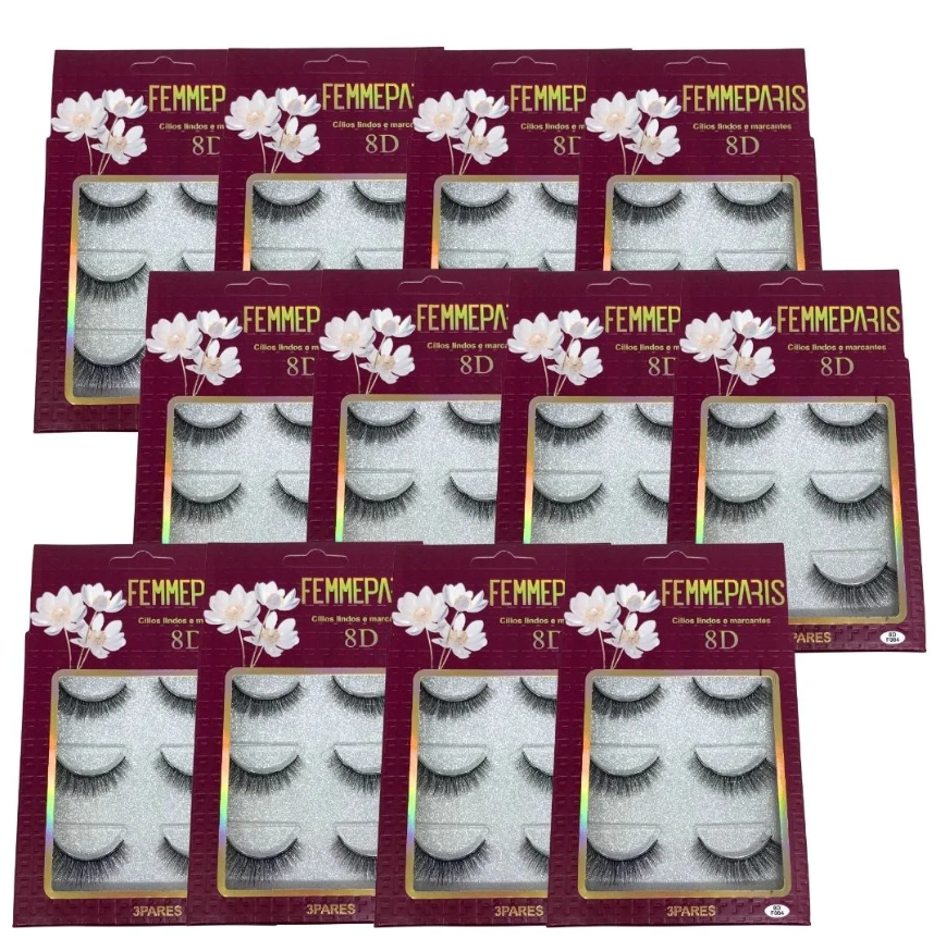 CÍLIOS POSTIÇOS 8D F004 COM 03 PARES FEMME PARIS FM1022 - BOX COM 12 UNIDADES
