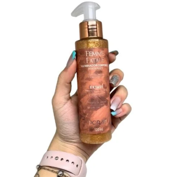 O Iluminador Corporal Êxtase Femme Fatale Porán PR352 é a escolha ideal para quem deseja destacar a pele com brilho elegante e fragrância marcante. Desenvolvido com notas de ameixa, cacau e almíscar, esse iluminador corporal traz uma fragrância intensa e concentrada, ideal para ocasiões especiais ou para quem gosta de brilhar no dia a dia. A linha shines da Porán entrega sofisticação e sensualidade em cada aplicação, conquistando olhares e elogios por onde passa.